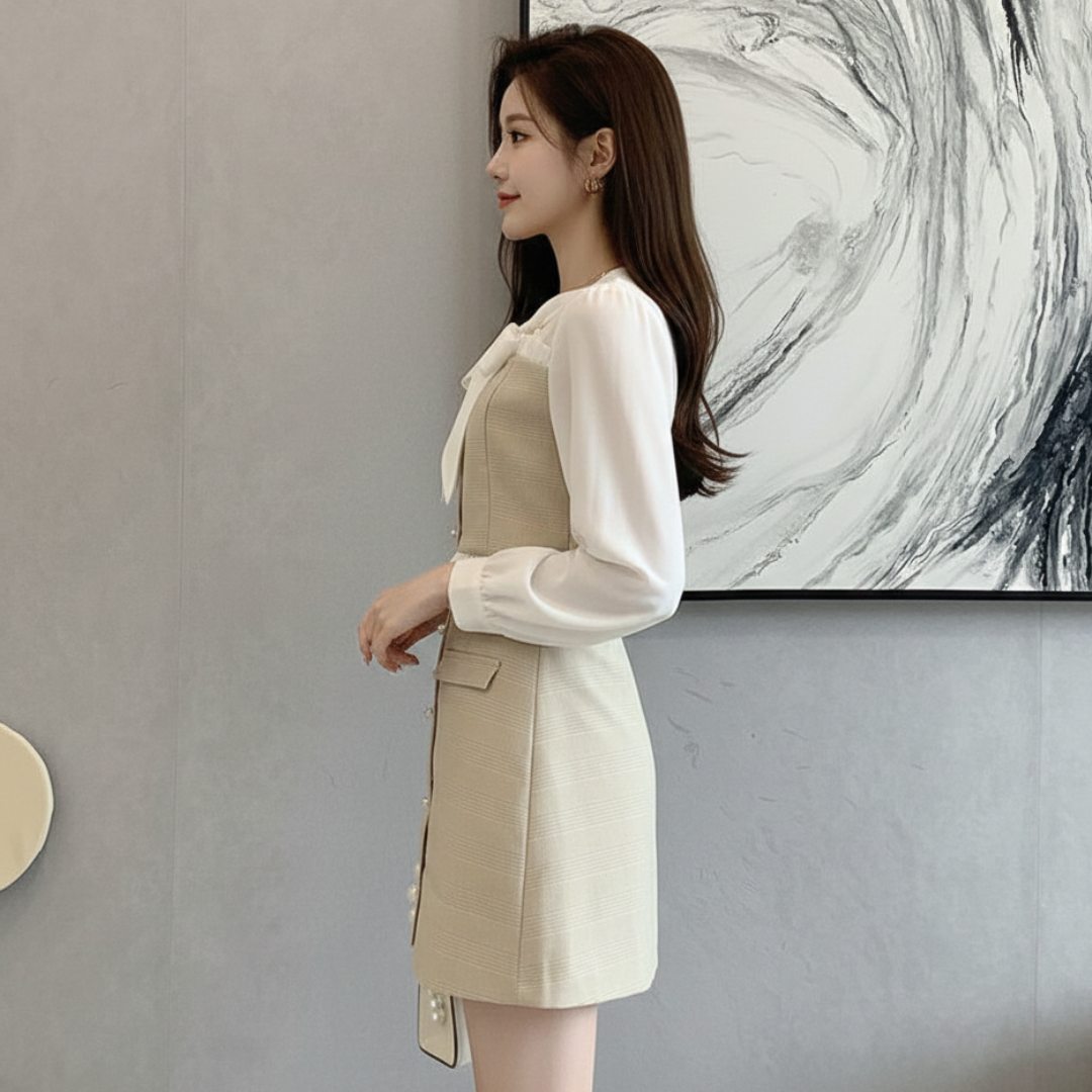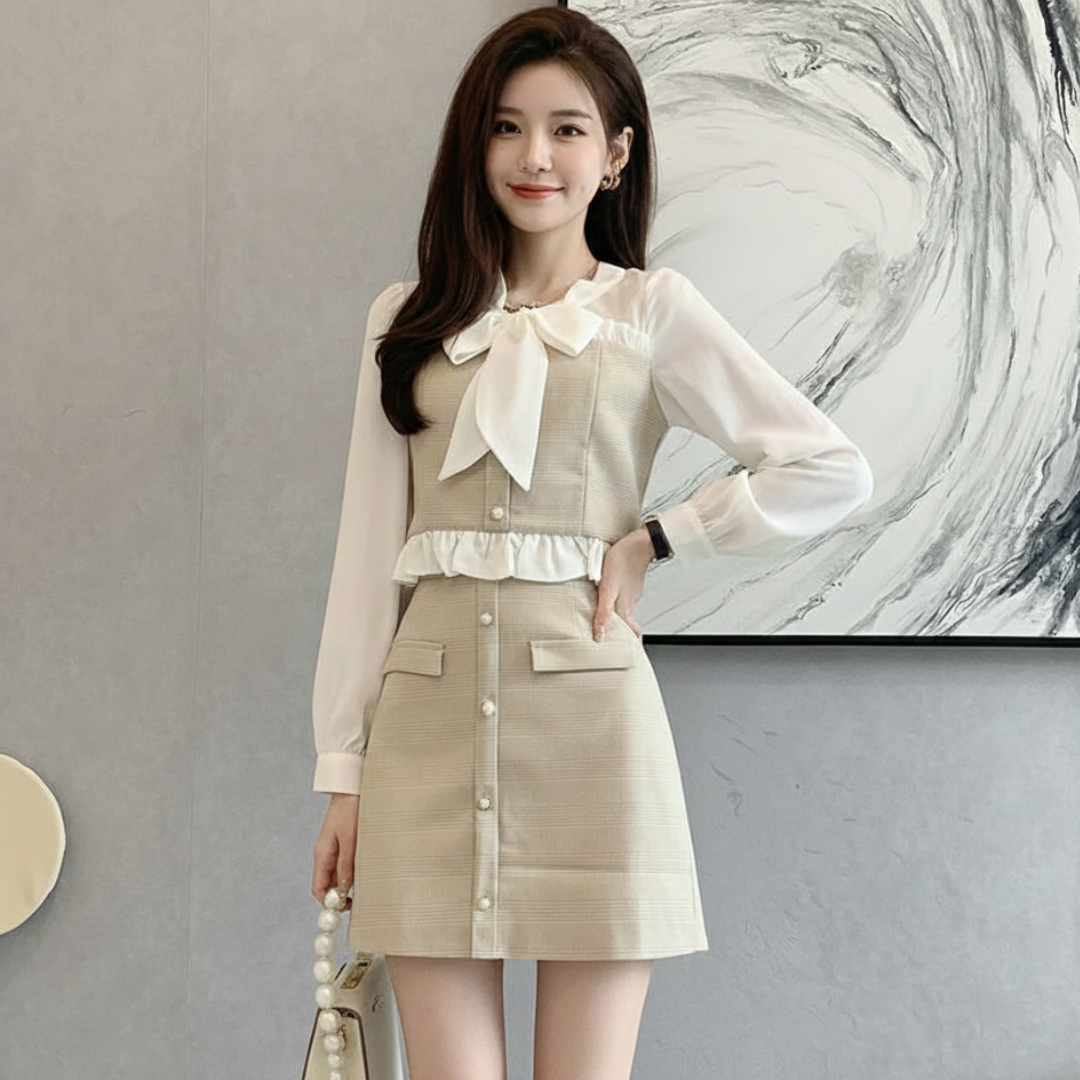 - Elegant Details: ตกแต่งด้วยกระดุมมุกและงานระบาย (Ruffle) เพิ่มมิติให้ชุดดูมีเลเยอร์