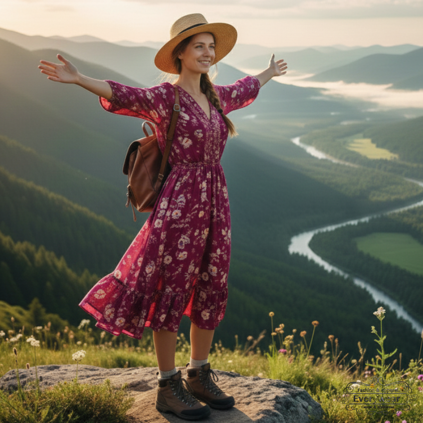 ดีไซน์: เดรสยาวคลุมน่อง (Midi Length) ทรงปล่อยสบายๆ พร้อมแขนยาวพองเล็กน้อย ไม่รัดรูป