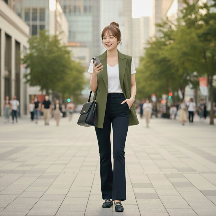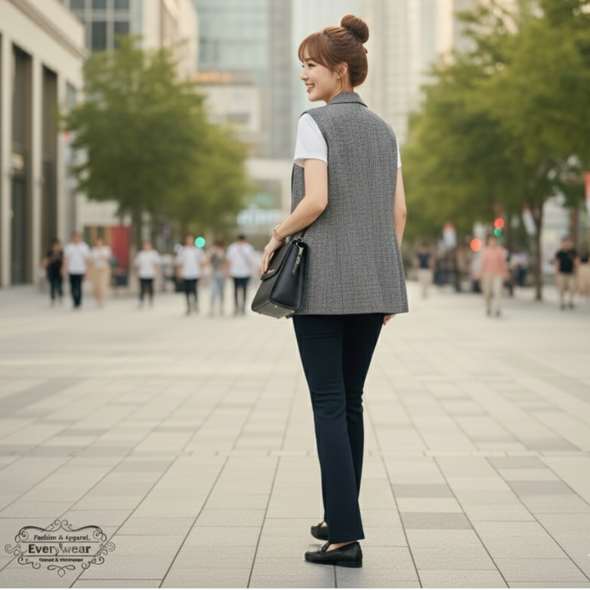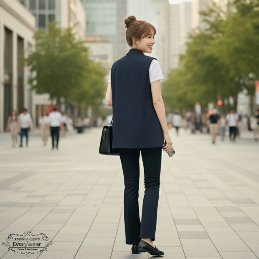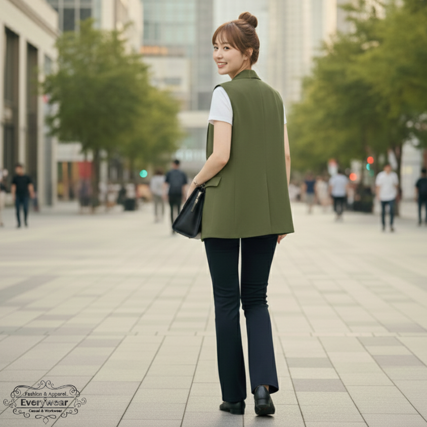 ดีไซน์: เสื้อกั๊กสูททรงยาว (Longline) แบบไม่มีแขน ปกคอวีช่วยให้ช่วงคอดูโปร่งและเพรียว