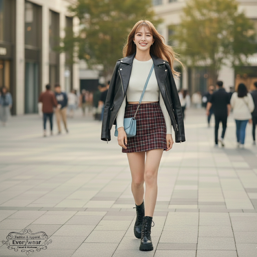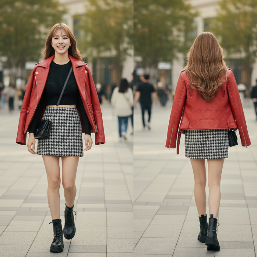 แจ็คเก็ตหนังคู่กระโปรง Houndstooth 🔥เปลี่ยนทุกฟุตบาทให้เป็นรันเวย์! ชุดเซ็ตสุดชิคที่ผสานความเท่และเซ็กซี่ไว้ด้วยกัน ครบชุด 3 ชิ้น (เสื้อครอป+กระโปรง+แจ็คเก็ตหนัง) ที่จะทำให้คุณโดดเด่นในทุกสายตา!